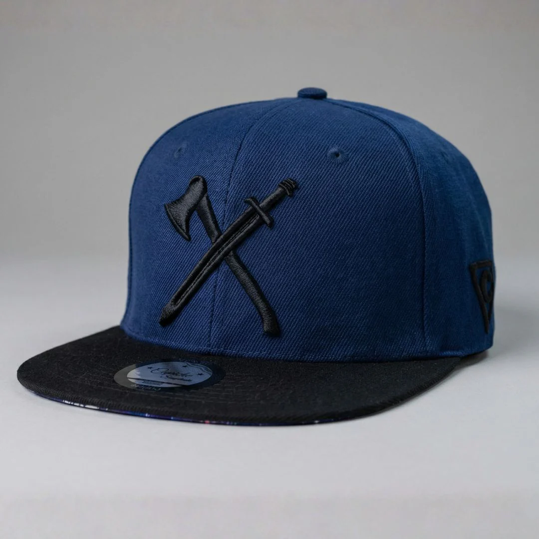 Ninja is a dark blue snapback with a black brim. The front logo is a black axe & sword. The left side of the snapback is embroidered with the traditional logo of Capiche and the back side is embroidered with “Capiche”. The embroideries are in black. The brim bottom is covered with the Ninja design. Ninja snapback is part of the Warrior collection.