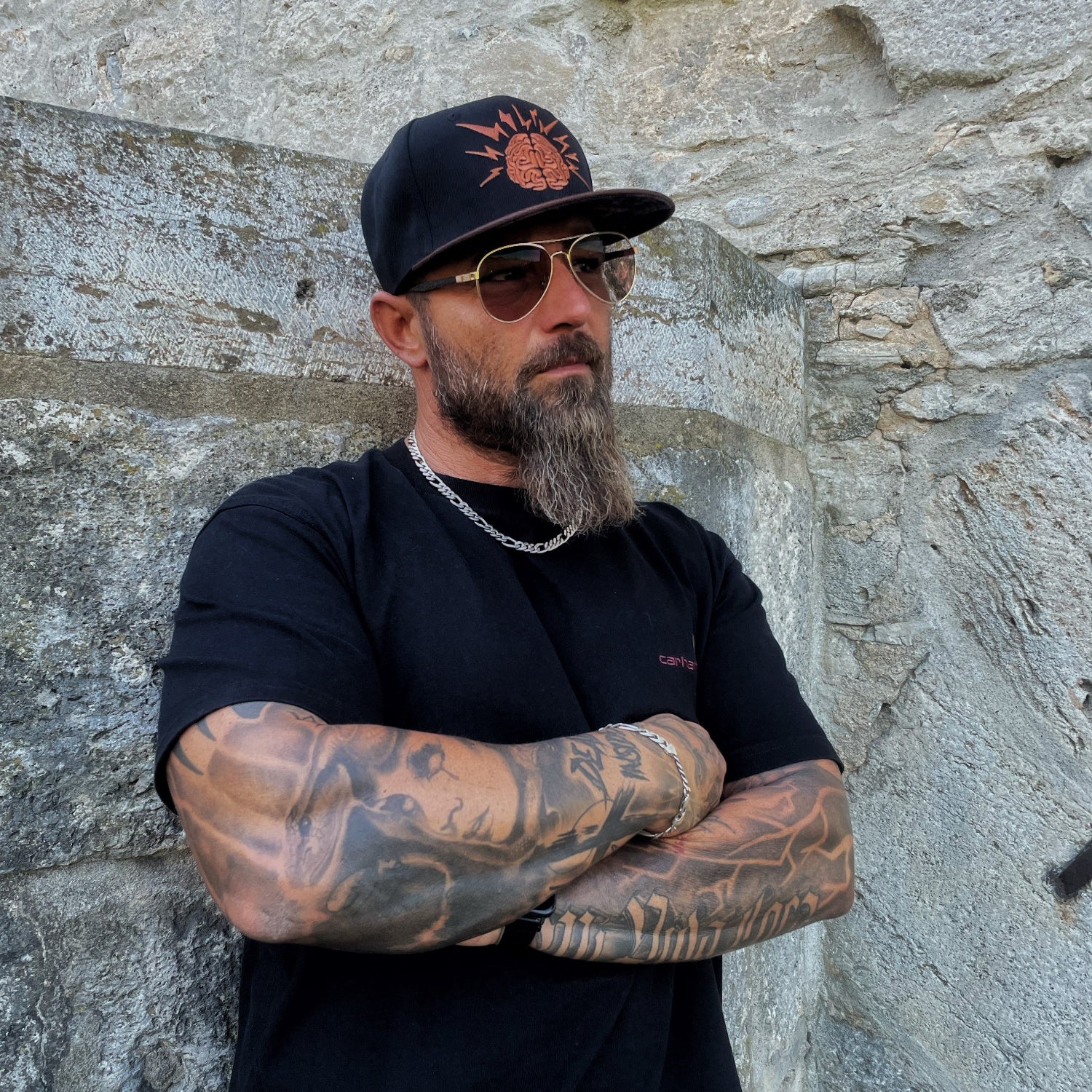Nobel is a black snapback with a brown brim. The front logo are brown brain with electricity sparks. The left side of the snapback is embroidered with the traditional C logo of Capiche and the back side is embroidered with Capiche. The embroideries are brown. The brim bottom is covered with the Nobel design.