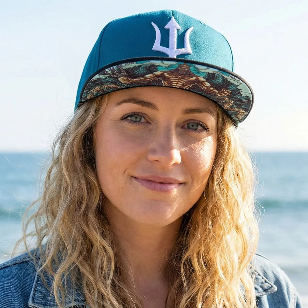 Poseidon is a blue snapback with a black brim. The front logo is a white trident. The left side of the snapback is embroidered with the traditional logo of Capiche and the back side is embroidered with “Capiche”. The embroideries are in white. The brim bottom is covered with the Poseidon design. Poseidon snapback is part of the Ancient Greek collection.