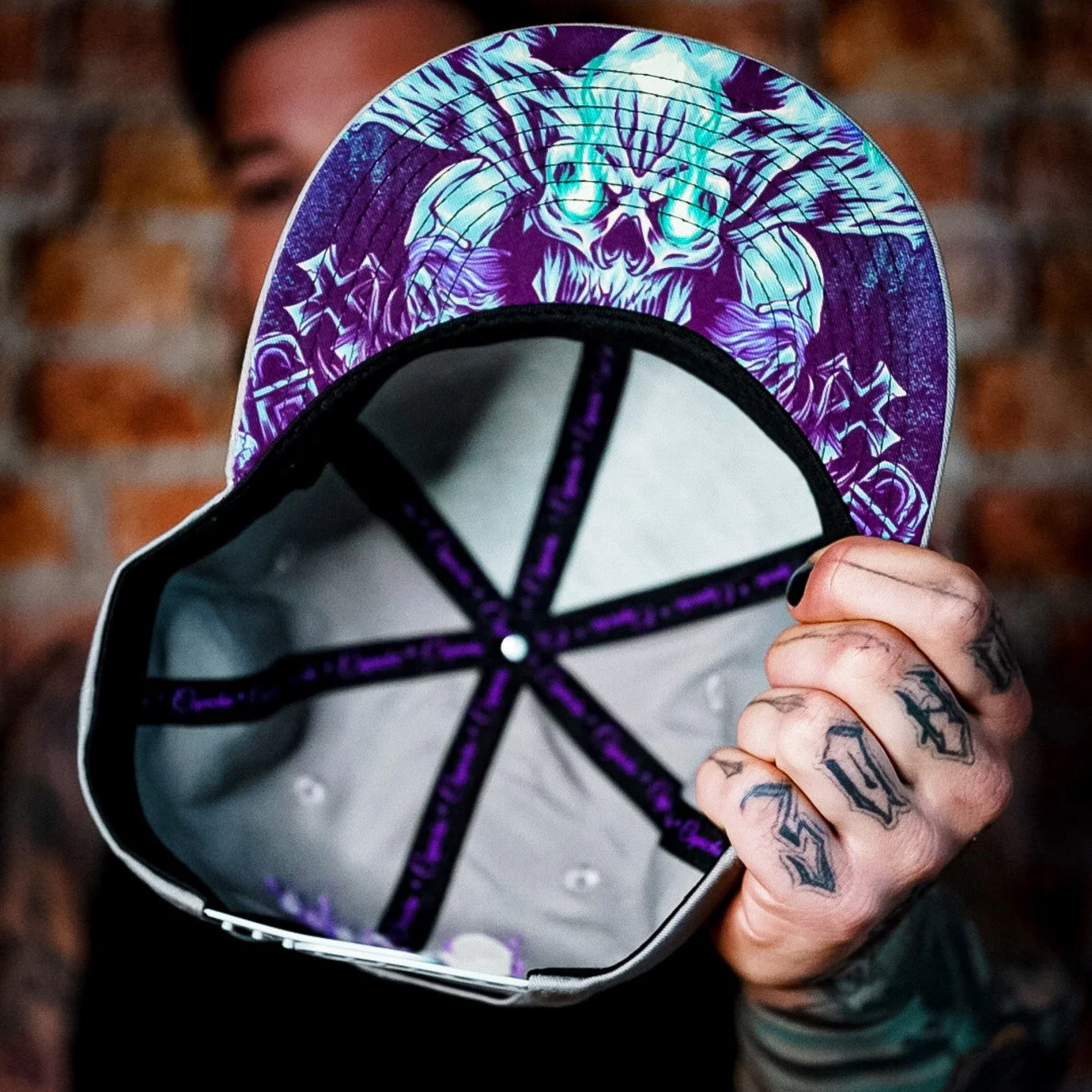 Purple Skull is a grey snapback with a grey brim. The front logo is a burning purple skull. The left side of the snapback is embroidered with the traditional C logo of Capiche and the back side is embroidered with Capiche. The embroideries are purple. The brim bottom is covered with the Purple Skull design.