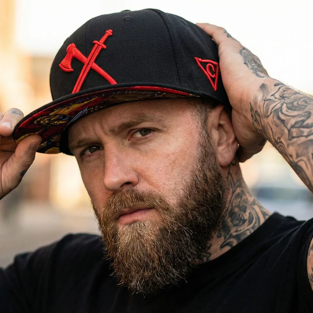 Roman Soldier is a black snapback with a black brim. The front logo is a red axe & sword. The left side of the snapback is embroidered with the traditional logo of Capiche and the back side is embroidered with “Capiche”. The embroideries are in red. The brim bottom is covered with the Roman Soldier design. Roman Soldier snapback is part of the Warrior collection.