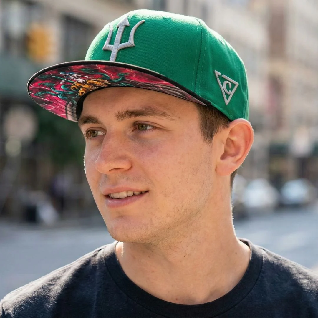 Scylla is a green snapback with a black brim. The front logo is a silver grey trident. The left side of the snapback is embroidered with the traditional logo of Capiche and the back side is embroidered with “Capiche”. The embroideries are in silver grey. The brim bottom is covered with the Scylla design. Scylla snapback is part of the Ancient Greek collection.