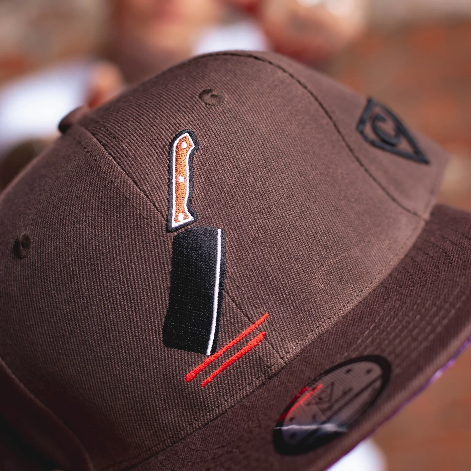 The Butcher is a brown snapback with a brown brim. The front logo is a butcher knife. The left side of the snapback is embroidered with the traditional logo of Capiche and the back side is embroidered with Capiche. The embroideries are black. The brim bottom is covered with The Butcher design.