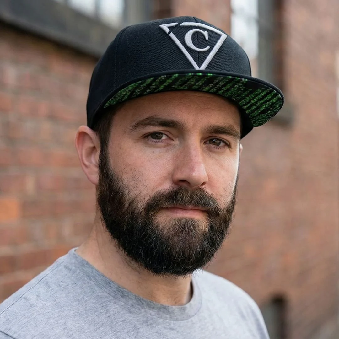 The Hacker is a black snapback with a black brim. The front logo is a grey Capiche logo. The back side of the snapback is embroidered with “Capiche”. The embroideries are in grey. The brim bottom is covered with the The Hacker design.